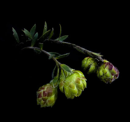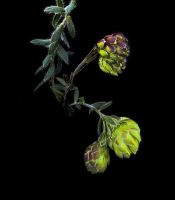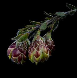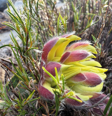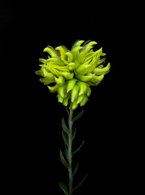 Descripción. Conocida en afrikáans como kleinbergdahlia, esta especie corresponde a un arbusto de porte bajo, postrado y rastrero, que alcanza entre 40 y 50 cm de altura. Presenta tallos densamente pubescentes y hojas elípticas con ligera vellosidad, lo que confiere una textura sedosa al follaje. Las inflorescencias se disponen en racimos globosos, péndulos y próximos al sustrato. Las flores son papilionáceas y hermafroditas, con pétalos de tonalidad amarilla; las brácteas estériles que rodean las flores exhiben una coloración marrón-rojiza. La planta emite un olor característico, similar al de la levadura. El fruto corresponde a una vaina inflada, lateralmente comprimida.
