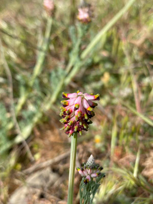Descripción. Planta herbácea de tallos erectos que pueden alcanza los 40-50 cm del altura. Hojas alternas, bipinnatisectas. Las inferiores son largamente pecioladas. Flores zigomorfas de color rosa o blanco con el margen del pétalo superior amarillo y verde. Se agrupan en inflorescencias de tipo racimo, muy densos con hasta 60 flores y globosos. Fruto monospermo y aplanado.