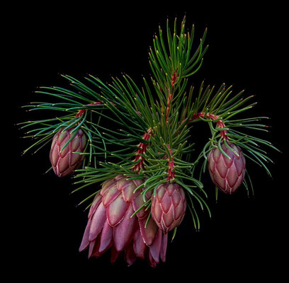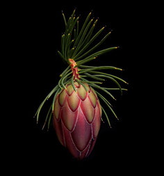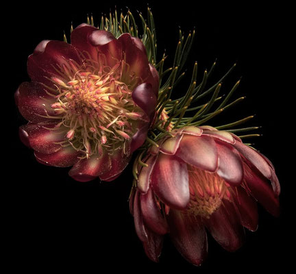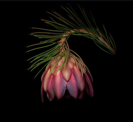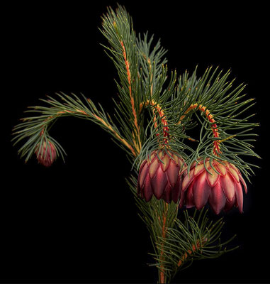 Descripción. Arbusto densamente ramificado, de porte redondeado, que alcanza hasta 1,5 metros de altura. Presenta un tallo principal bien definido del cual emergen ramas verdes que adquieren tonalidades rojizas conforme maduran. Las hojas son aciculares, glabras, de color verde oscuro y con brillo superficial, curvadas hacia el ápice. Las inflorescencias se disponen en cabezuelas colgantes, orientadas hacia el suelo. Las brácteas involucrales son de color rojo intenso y contrastante. Las flores individuales son tubulares, con un estilo largo y curvado, típico del género. Los frutos contienen semillas pequeñas y livianas, adaptadas para la anemocoria (dispersión por el viento).