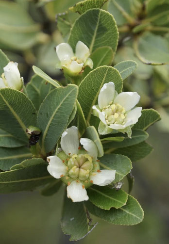 Descripción. Arbusto o pequeño árbol que alcanza 3-4 metros de altura. Dioico y de corteza cenicienta. Las hojas son oblongas, de margen aserrado, verde claro por el haz y verde plateado por el envés, con la nerviación bien marcada. Flores pentámeras, unisexuales y blancas. Las femeninas son solitarias y presentan un ovario pentalobulado y las masculinas se agrupan en corimbos y presentan un androceo con 15 estambres. Fruto en cápsula estrellada leñosa.
